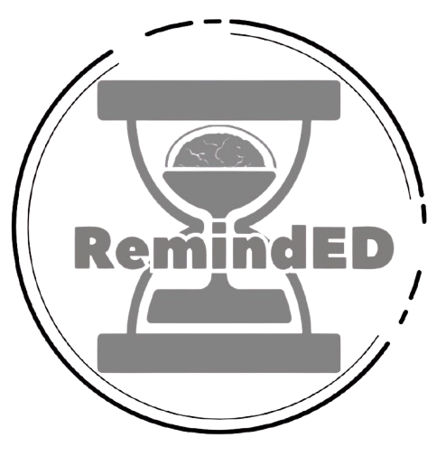 The border of the logo is an incomplete circle, which powerfully symbolizes the dynamic and continuous cycle of learning that a student goes through within the RemindED system. It represents the journey from initial exposure to a new concept, through the natural process of forgetting, to the crucial moment of recall prompted by the app. The circle remains open because true understanding isn't a static endpoint but a progressive path of reinforcement.
